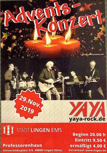 In diesem Jahr – 2025! – feiert YAYA sein 30jähriges Bestehen, mit Auftritten im Professorenhaus, im Alten Schlachthof (23.02.), im Festivalpark Wilhelmshöhe (02.07.) und – in Wiederaufnahme einer alten Tradition: - erneut im TPZ (29.11.), wo es wieder gilt, in den Advent zu rocken.